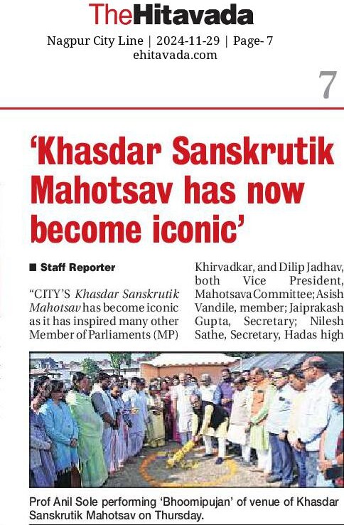 Prof Atul Moghe, Prant Karyavah, Rashtriya Swayamsewak Sangha; Prof Anil Sole, President, Khasdar Sanskrutik Mahotsava; Pravin Datke, MLA; Dr Upendra Khothekar, Organization Secretary, BJP, Dipak Khirvadkar, and Dilip Jadhav, both Vice President. Mahotsav Committee; Asish Vandile, member; Jaiprakash Gupta, Secretary; Nilesh Sathe, Secretary, Hadas School; Sanjay Bhende. President, Nagpur Nagrik Sahkari Sangha amon others were present for the pro- gramme.